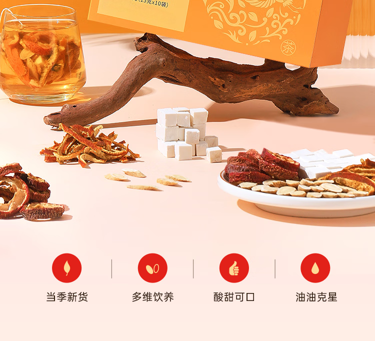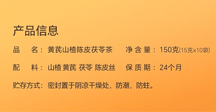 主要成分为山楂、黄芪、陈皮、茯苓等,主要功效补气健脾,祛湿消食等