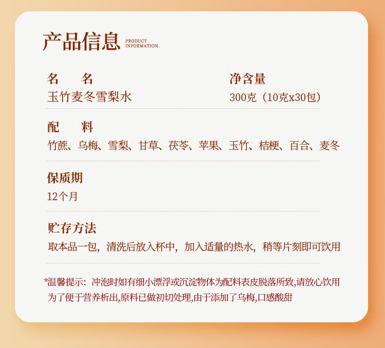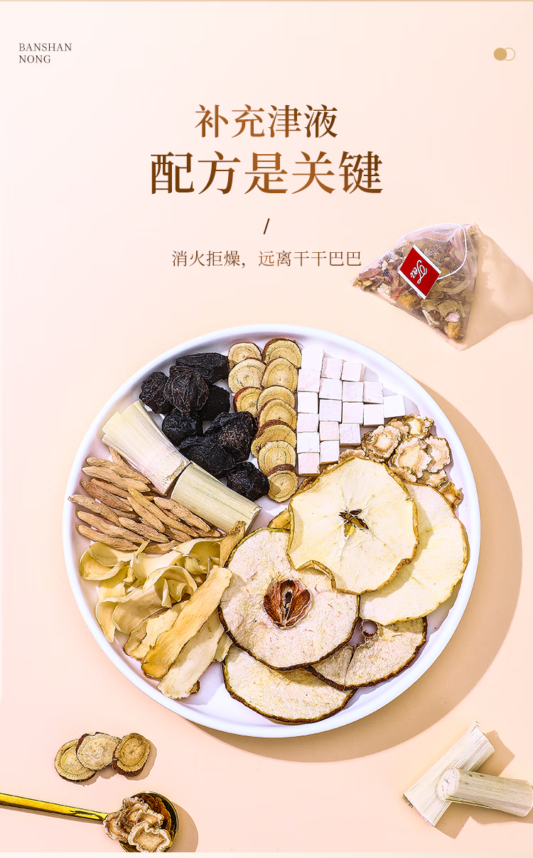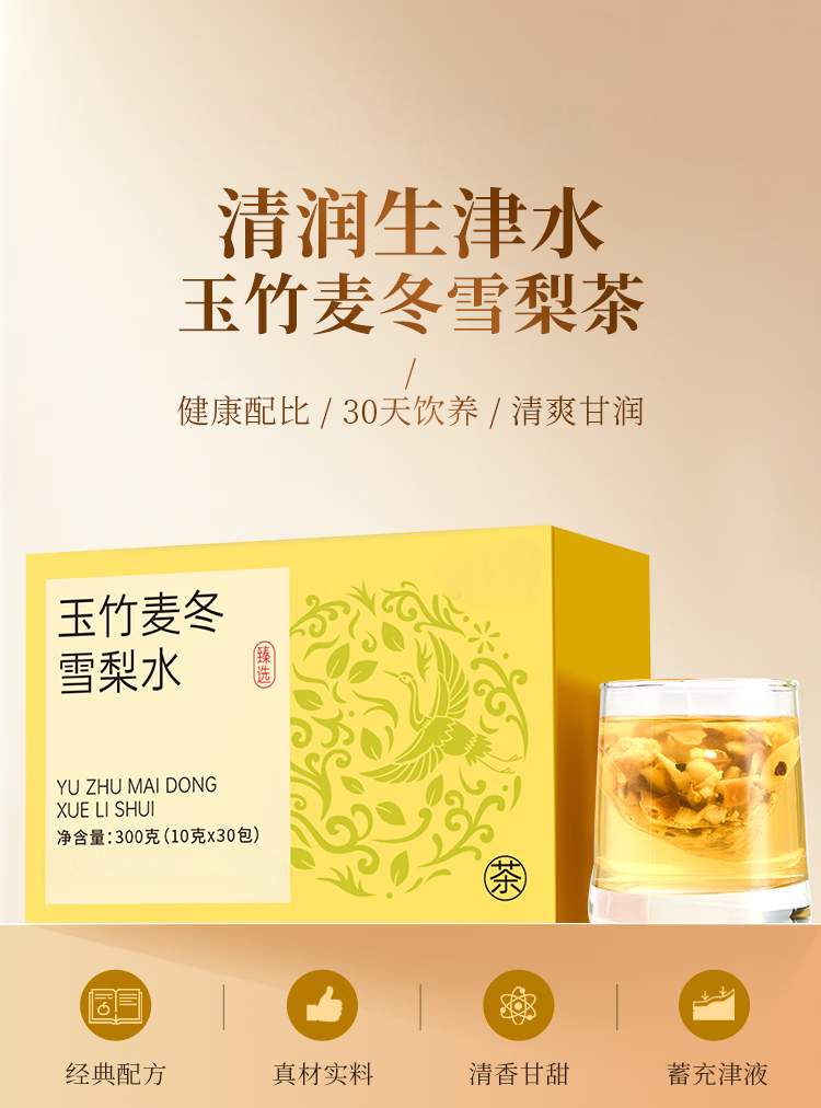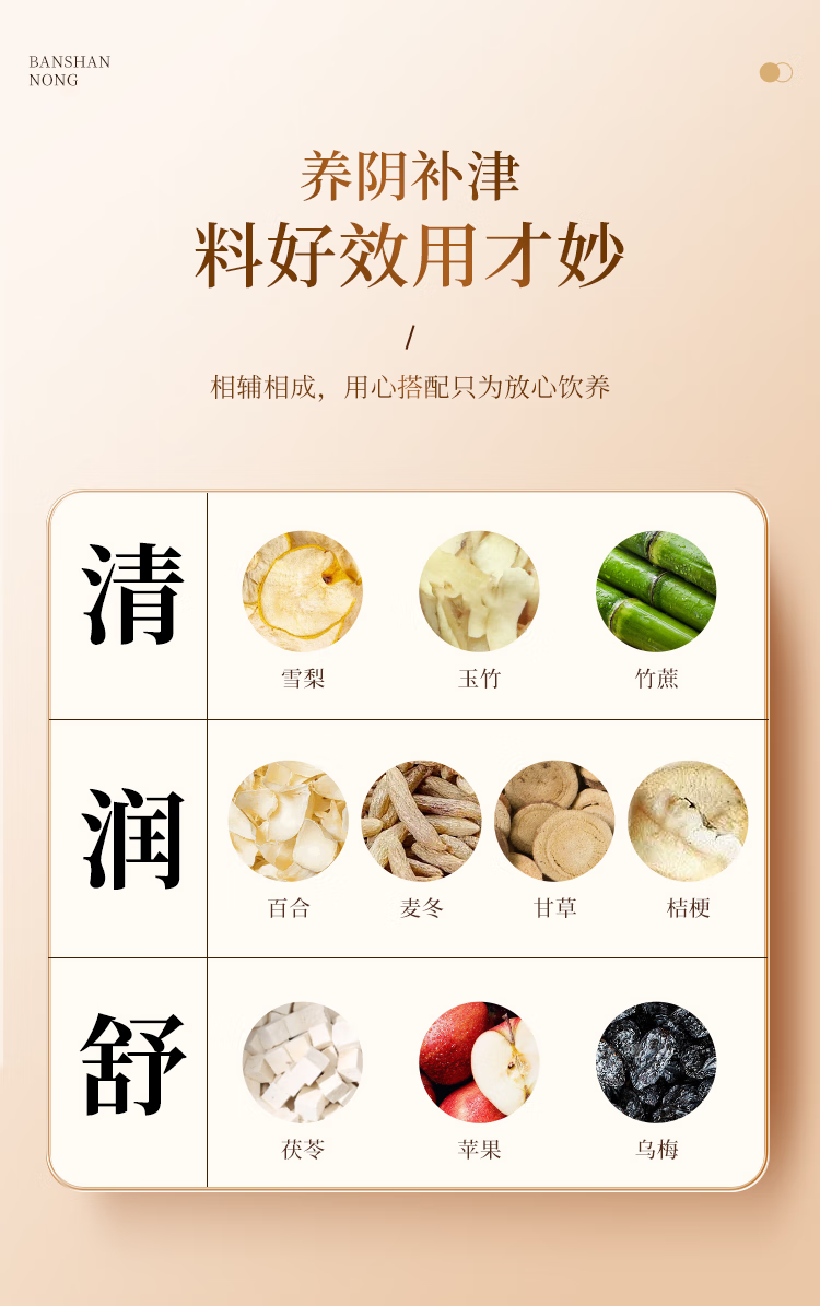 主要成分为雪梨、玉竹、百合、甘草等,主要功效生津燥润,养阴补津等